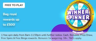 Get one free spin on the Thrills & Chills Winner Spinner Wheel every day for a random prize of Cash prize draw tickets, free bingo sessions, free bingo tickets or Slingo/All games bonuses.